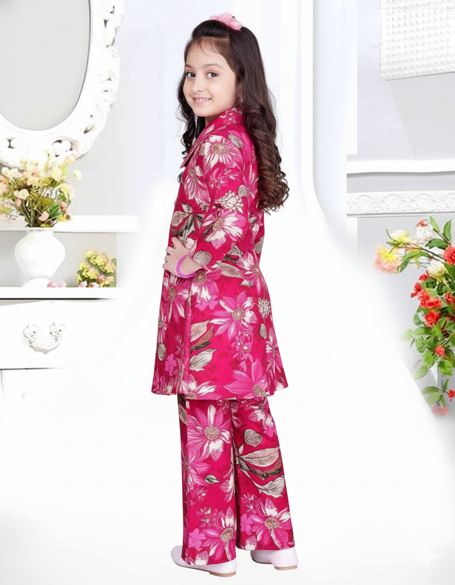 Step into a garden of style with our “Blooming Petals” Floral Co-ord Set! 🌸 This charming two-piece ensemble features a vibrant pink base adorned with an exquisite all-over floral print, showcasing delicate green leaves and beautiful white and light pink blossoms. The top is designed with a stylish flared cut, a classic collar, and elegant buttons down the front, perfectly complementing the comfortable wide-leg pants that complete the look. Crafted from soft, breathable fabric, this outfit ensures all-day comfort while keeping your little one looking effortlessly chic. Ideal for parties, family gatherings, or a day out with friends, this set is a must-have for any fashion-forward young lady. ✨👗👖 Let her bloom with confidence in this delightful and eye-catching outfit!