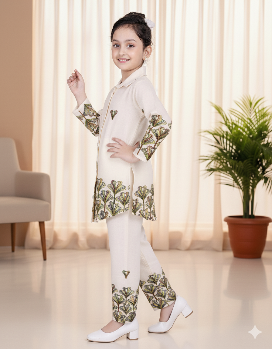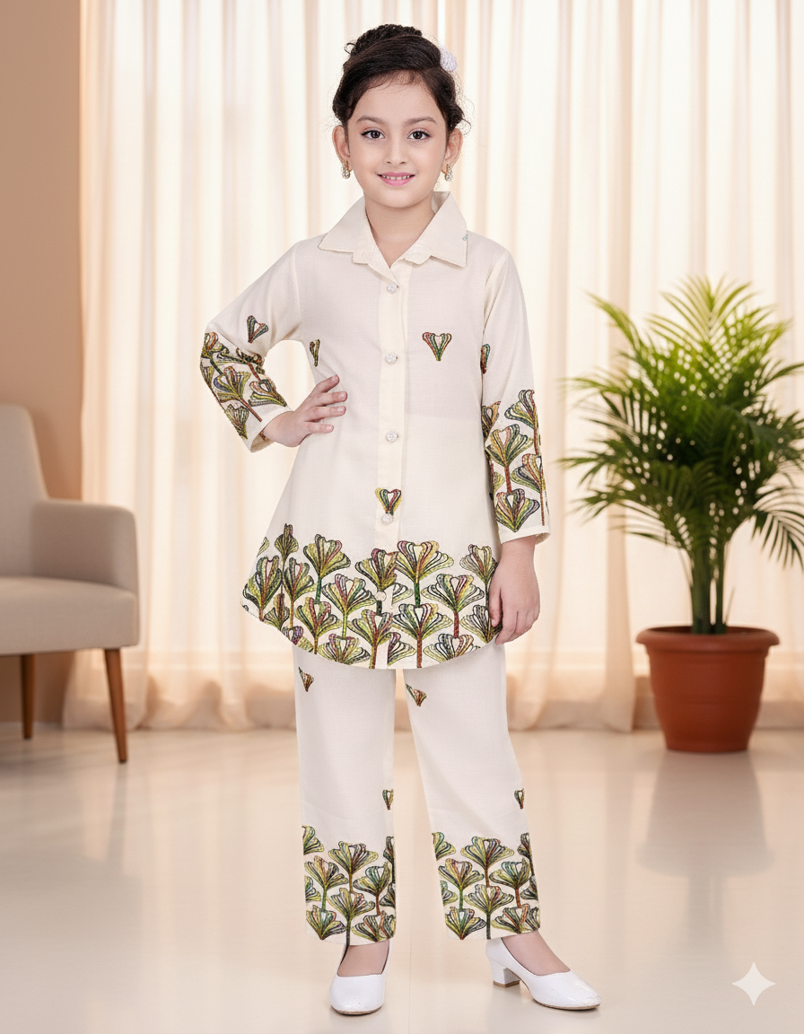 This beautiful outfit features a soft cream base adorned with colorful leafy floral motifs on the sleeves, hem, and pants. The smart collared neckline and front button-down design add a touch of sophistication, while the comfortable cotton blend fabric keeps her feeling fresh all day long.
