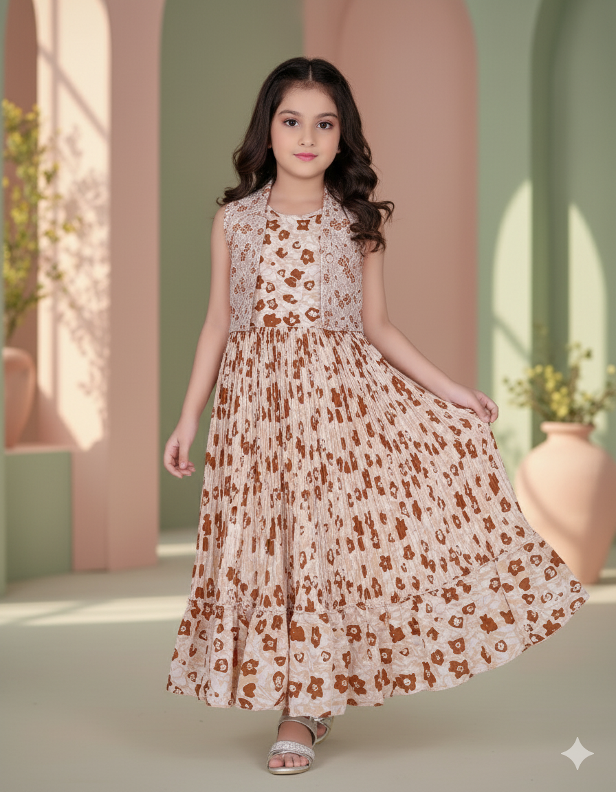 Let your little princess twirl in elegance with our Floral Charm Pleated Maxi Dress 👗✨. Designed with soft, breathable fabric and a beautiful mix of beige and brown floral prints, this dress ensures comfort and style for every occasion. The delicate lace shrug adds a touch of grace, making it perfect for parties, family gatherings, or festive celebrations 💖. Pair it with cute sandals or ballerinas to complete the charming look! 🌷